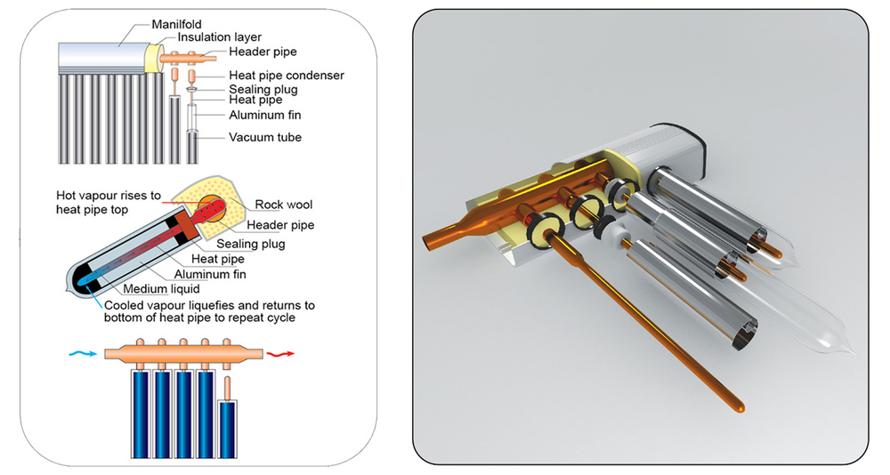 热管是一根密封的铜管,内装有少量挥发性液体和一些特殊添加剂,但不含空气。热管真空管由玻璃真空管和由铝片和硅塞固定的铜热管组成。当铜热管被加热时,它会将热量传导到插入总管(歧管内部)的顶端(冷凝器)。水流过总管,使热量从热管冷凝器传递到水中。