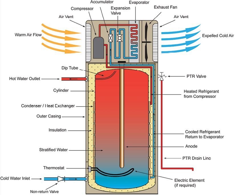 热泵热水器的工作原理就像空调或冰箱一样。它从空气中吸收热量并将其传递给热水。因此它也被称为空气源热泵。它靠电力运行,但比传统的电热水器更高效。